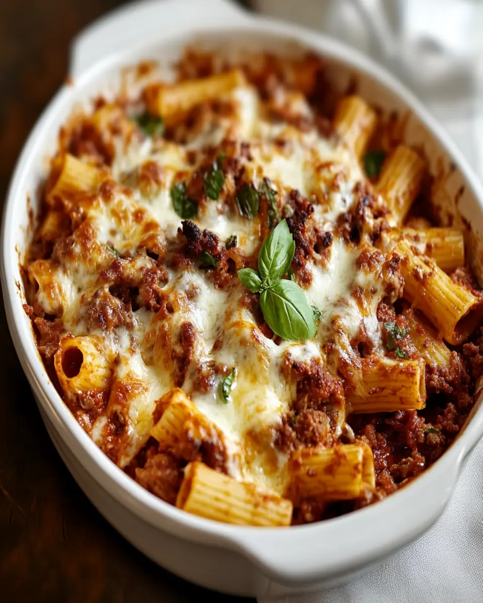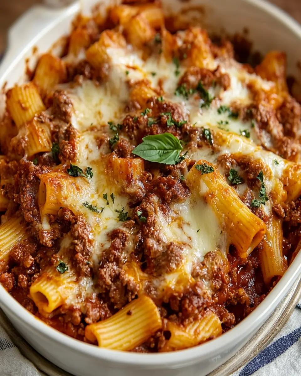 A hearty and comforting baked rigatoni dish loaded with flavorful meat sauce and cheese.