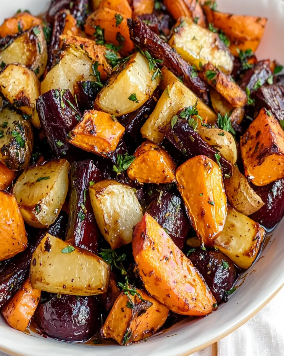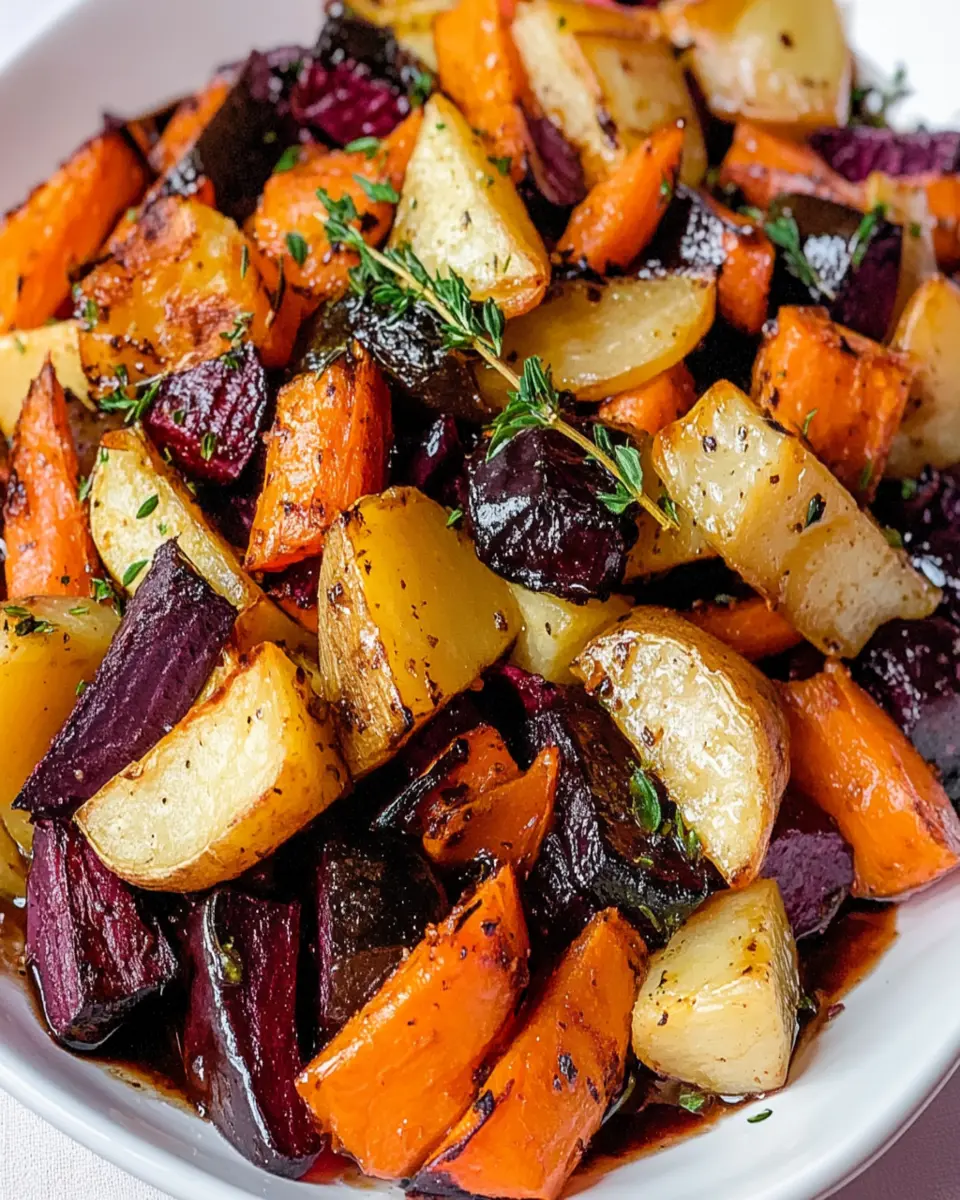 A delicious mix of roasted root vegetables with balsamic glaze, perfect as a side dish.