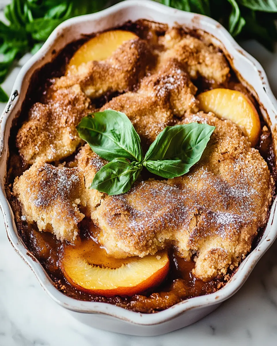 A delightful cobbler featuring juicy peaches and aromatic basil, perfect for summer gatherings.