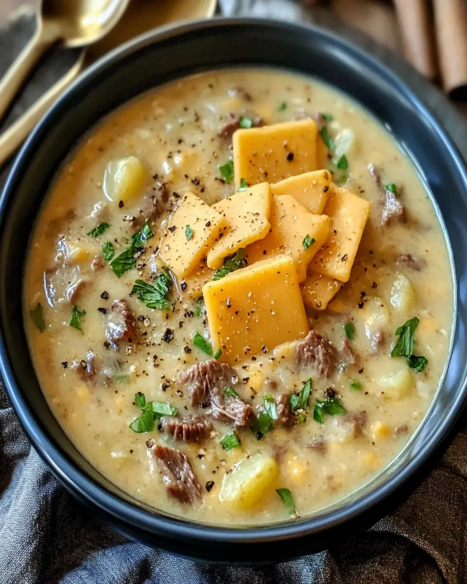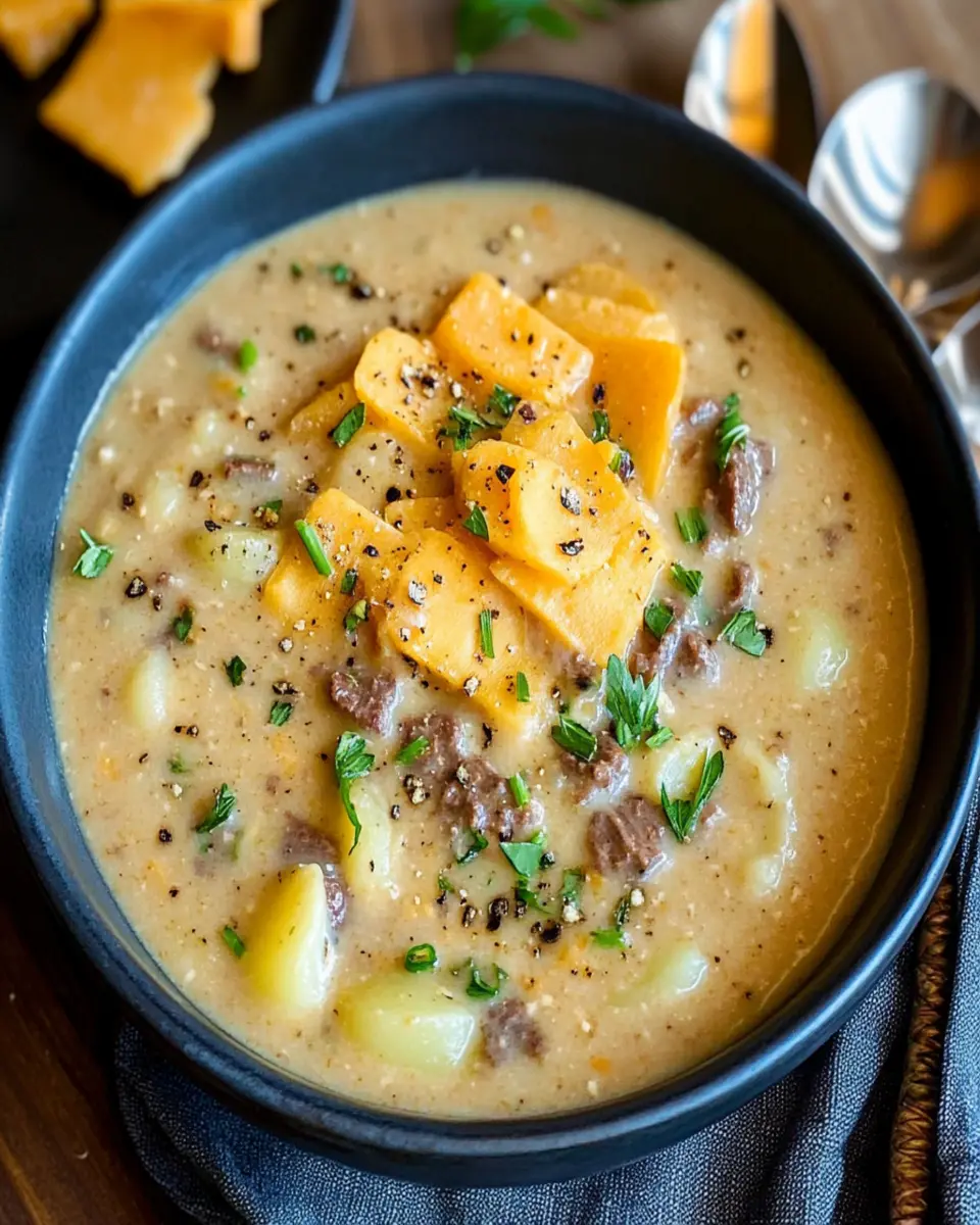 In conclusion, the Beef & Smoked Cheddar Potato Soup is a delightful combination of hearty ingredients that makes it perfect for chilly evenings. This recipe not only provides comfort but also delivers a satisfying meal packed with flavor and nutrition. Whether you’re cooking for yourself or sharing with loved ones, this soup is sure to be a hit. So, don your apron, gather your ingredients, and enjoy the warm embrace of this delicious soup. Don’t forget to cook, save, share, and comment on your experiences!