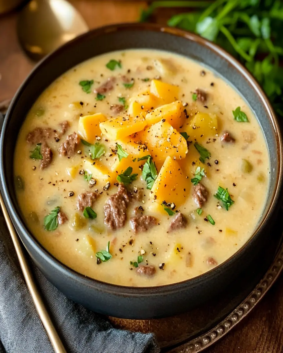 This hearty beef and smoked cheddar potato soup is perfect for a cozy dinner on a chilly day.