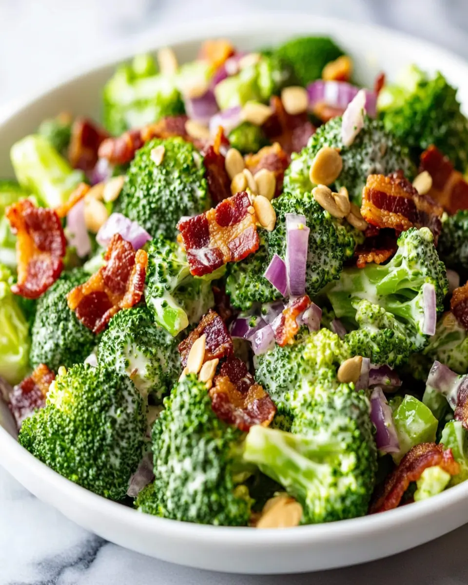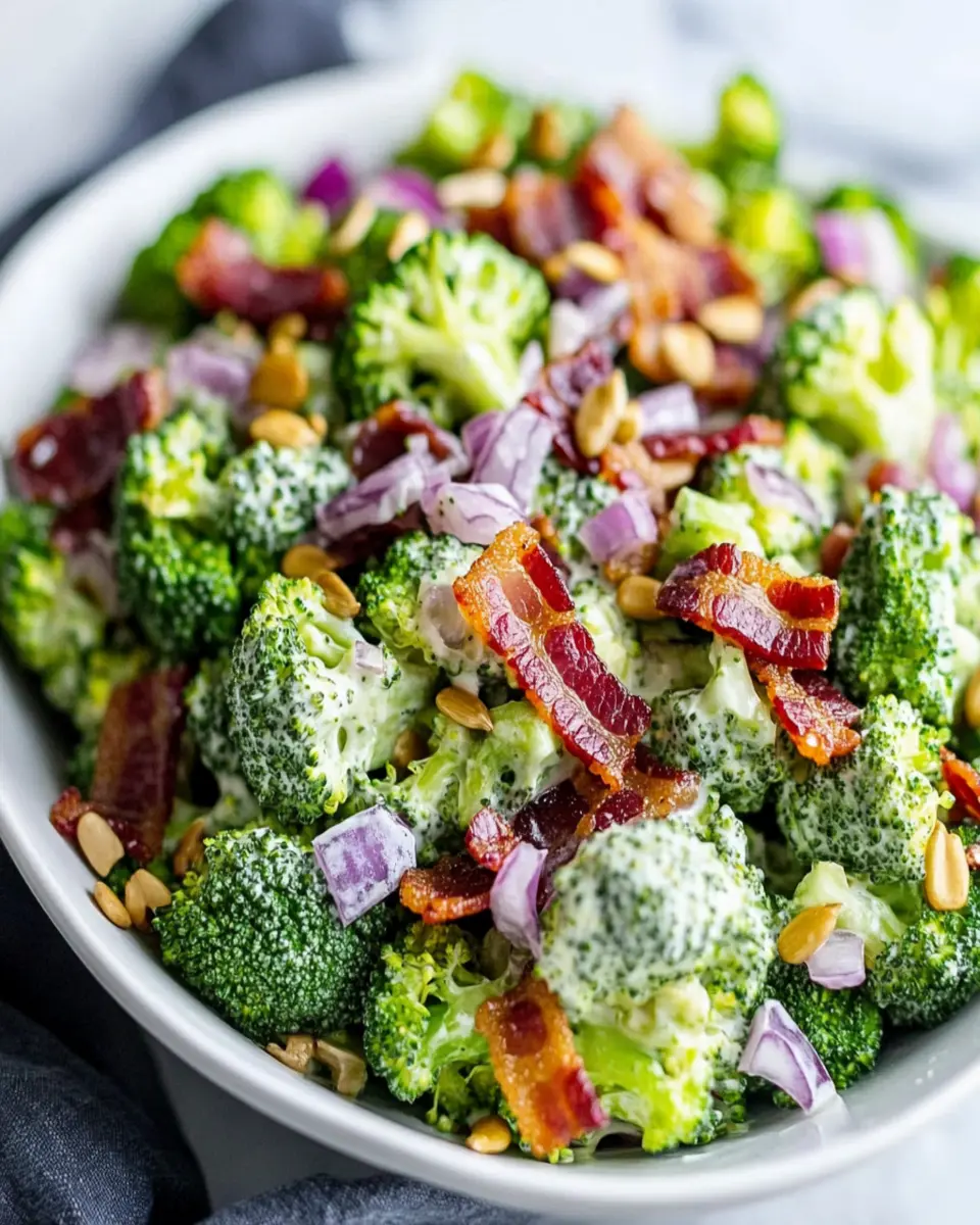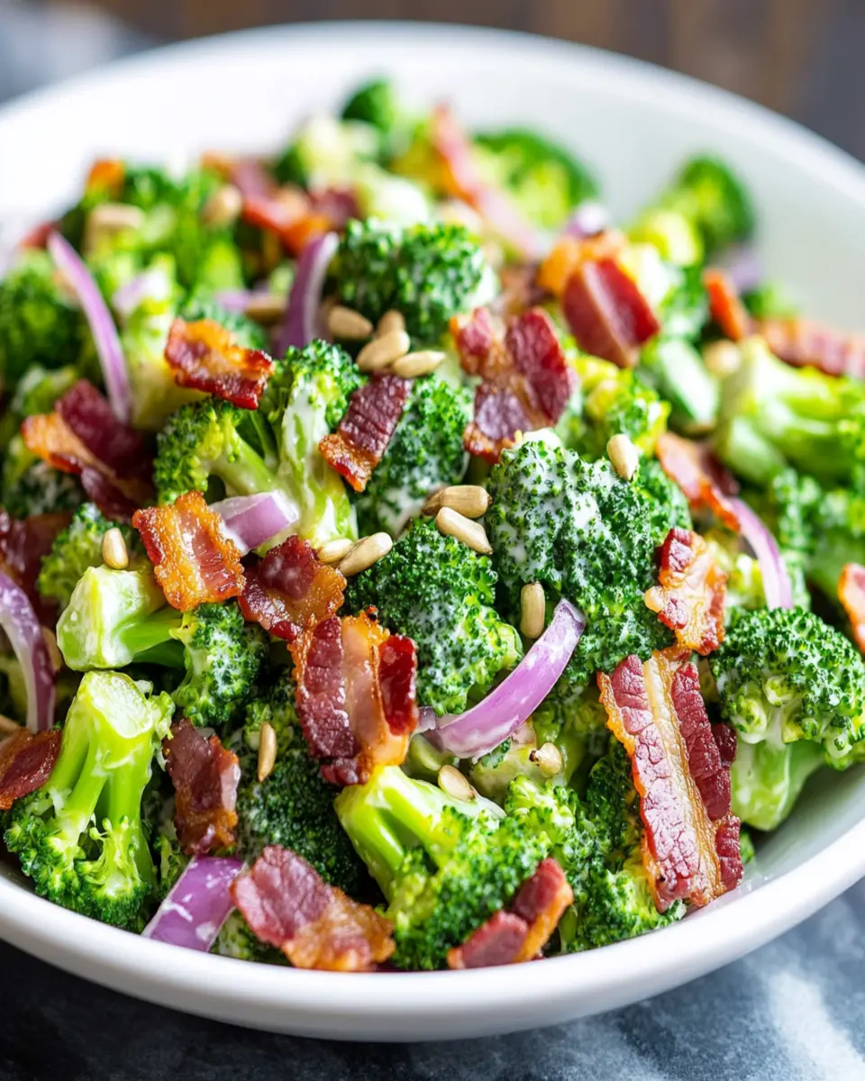 A delicious salad combining fresh broccoli, crispy bacon, and a creamy dressing.