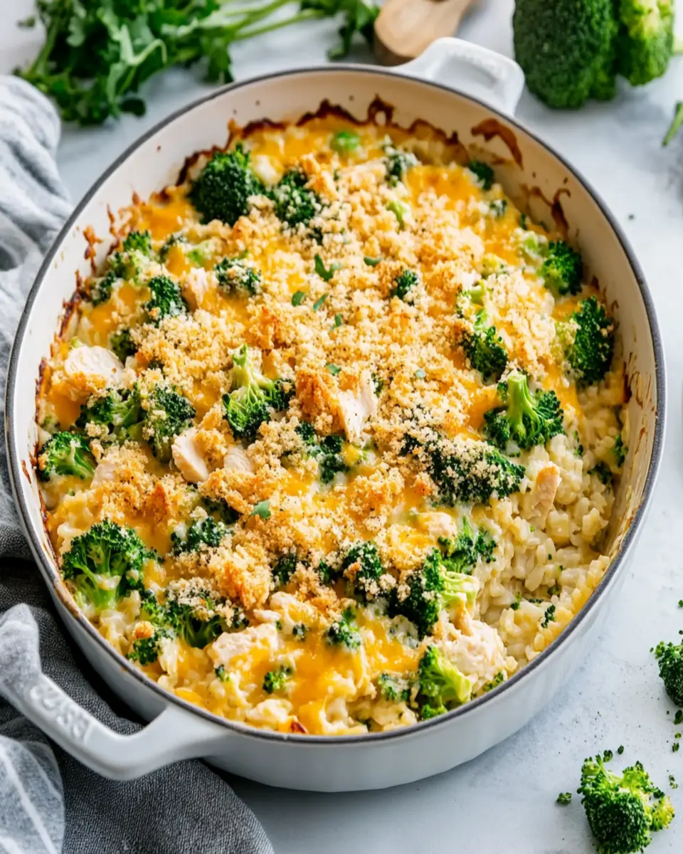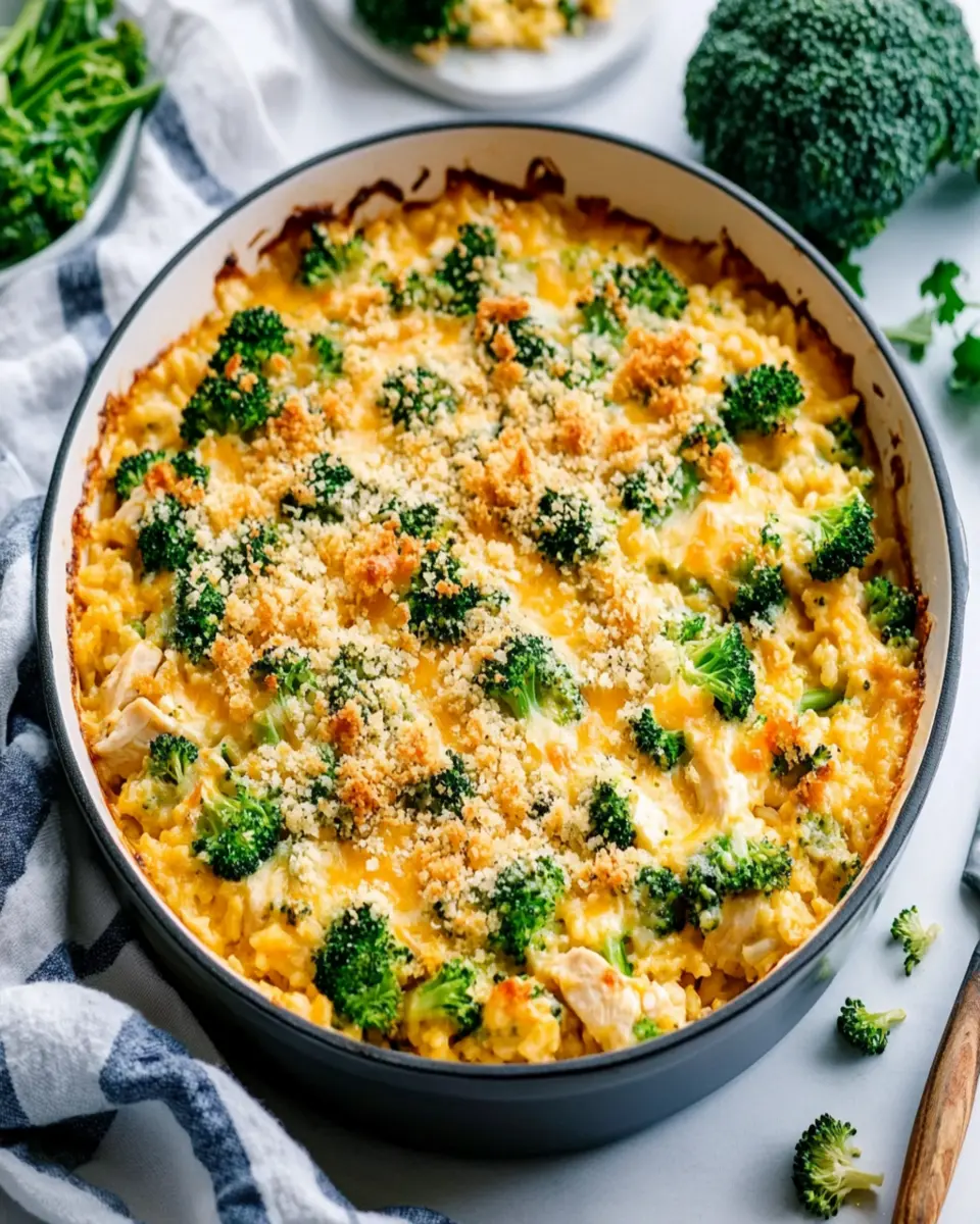 A hearty and comforting casserole featuring chicken, broccoli, and rice, perfect for family dinners.