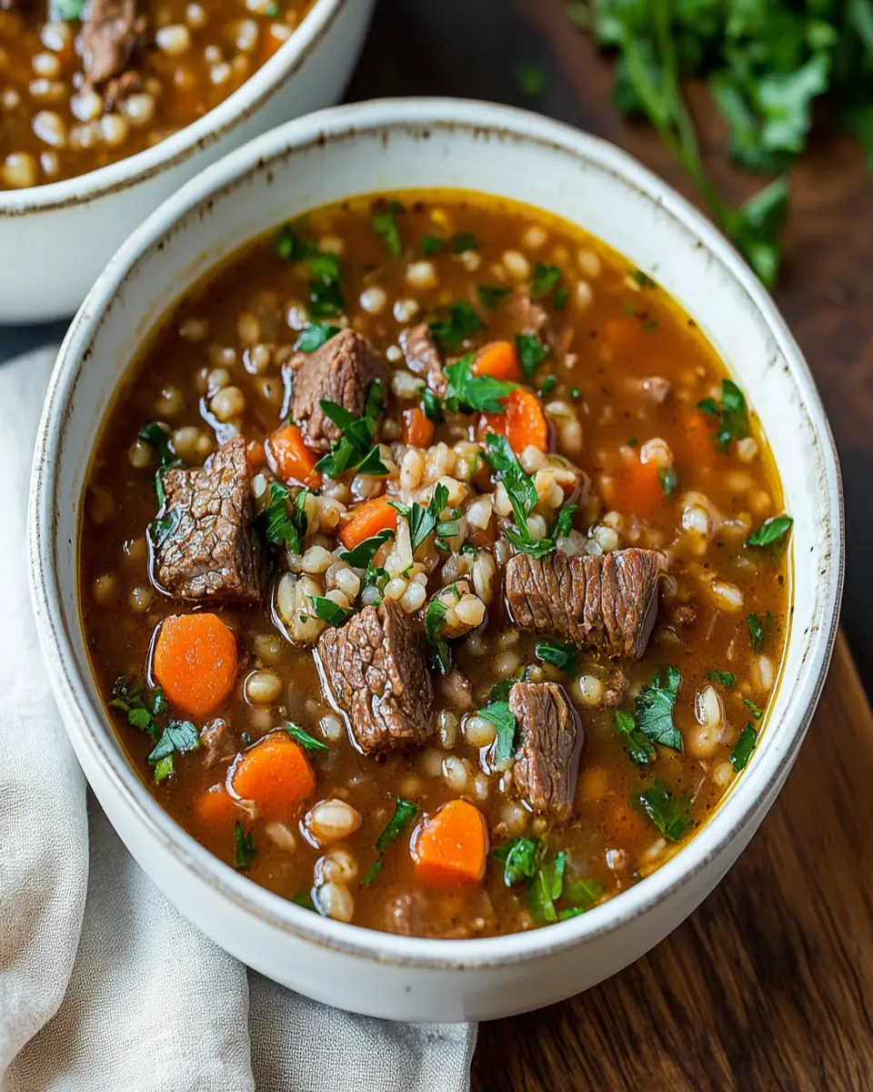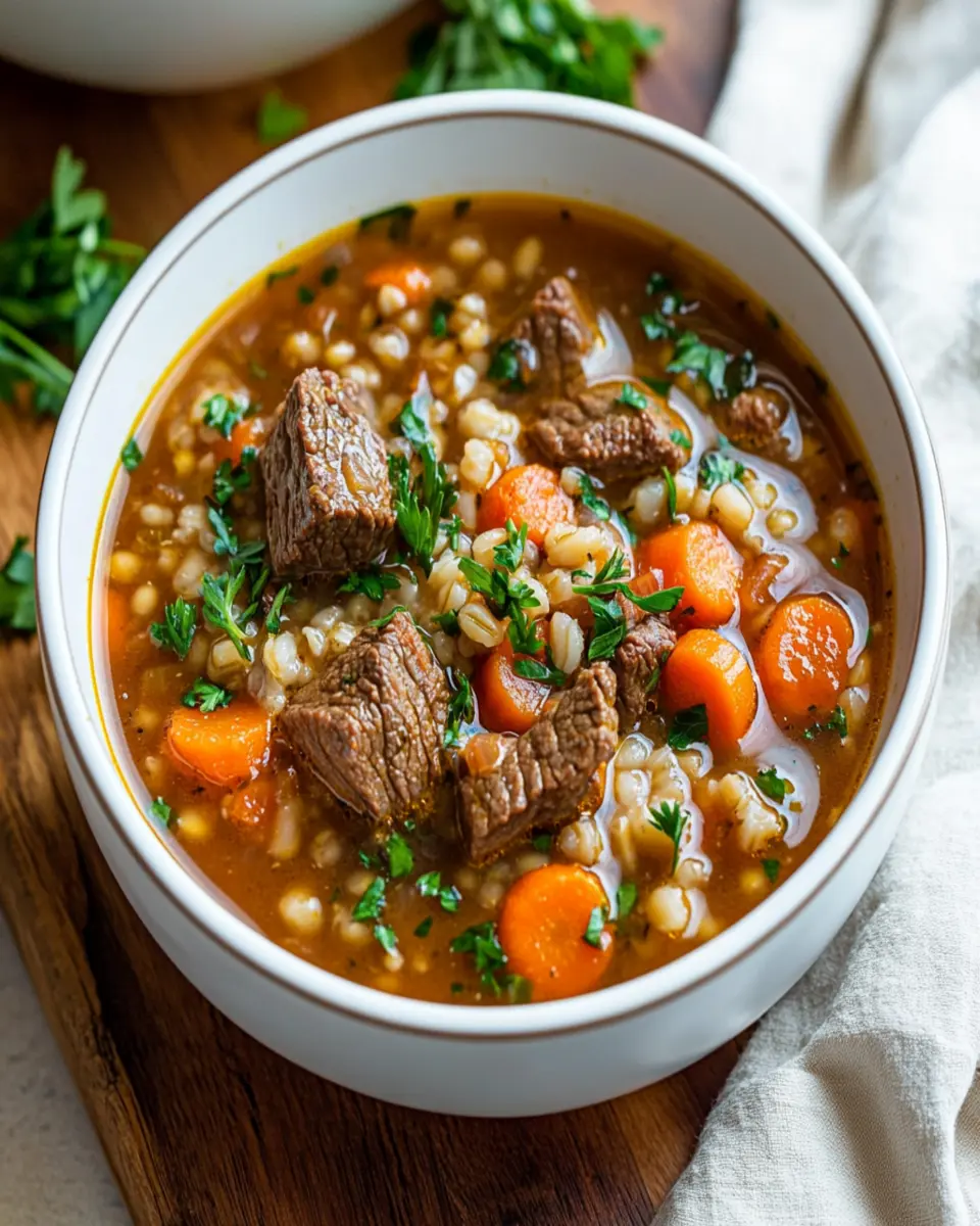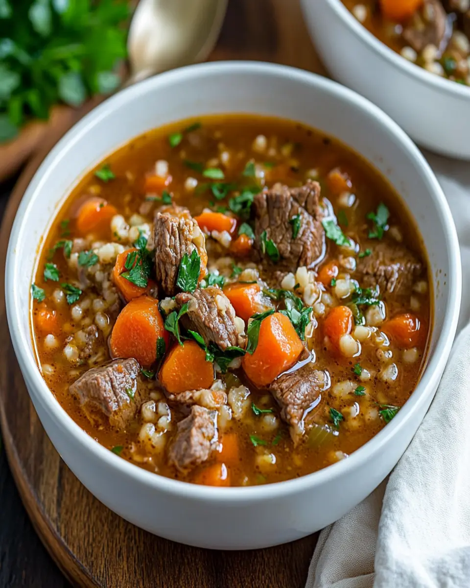 A hearty and nourishing soup loaded with beef, barley, and vegetables.