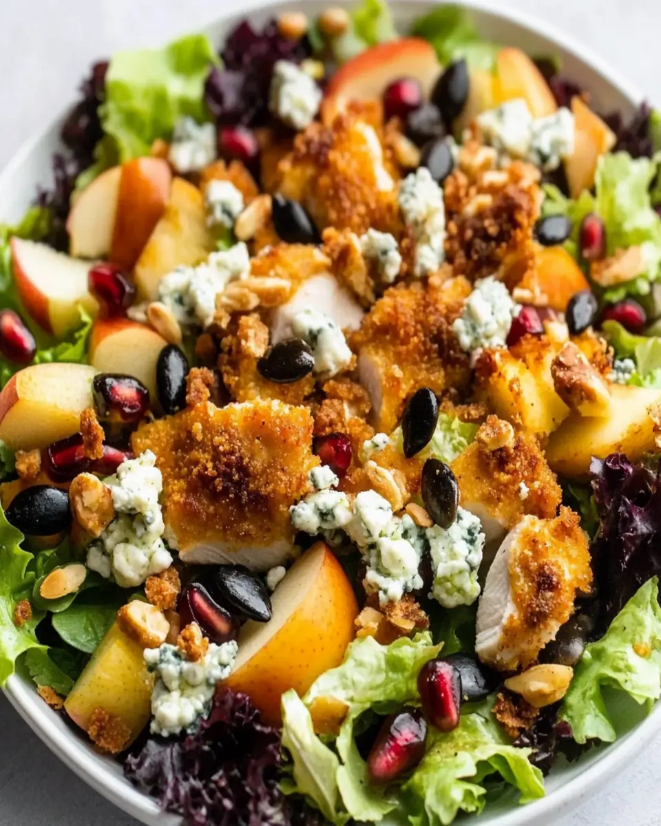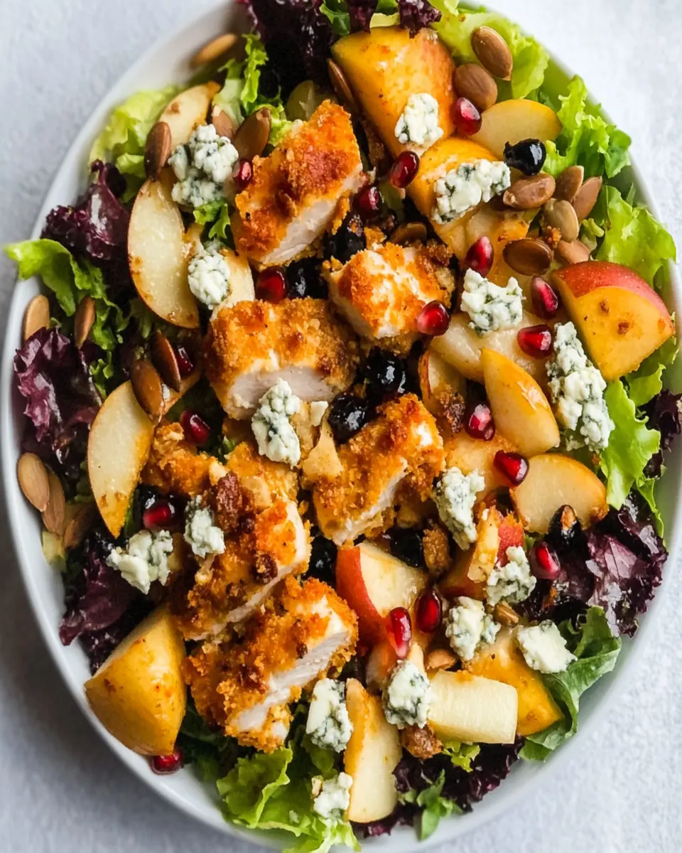 A delightful salad featuring crispy baked cornmeal chicken, fresh apples, tangy Gorgonzola cheese, and seasonal greens, perfect for autumn!