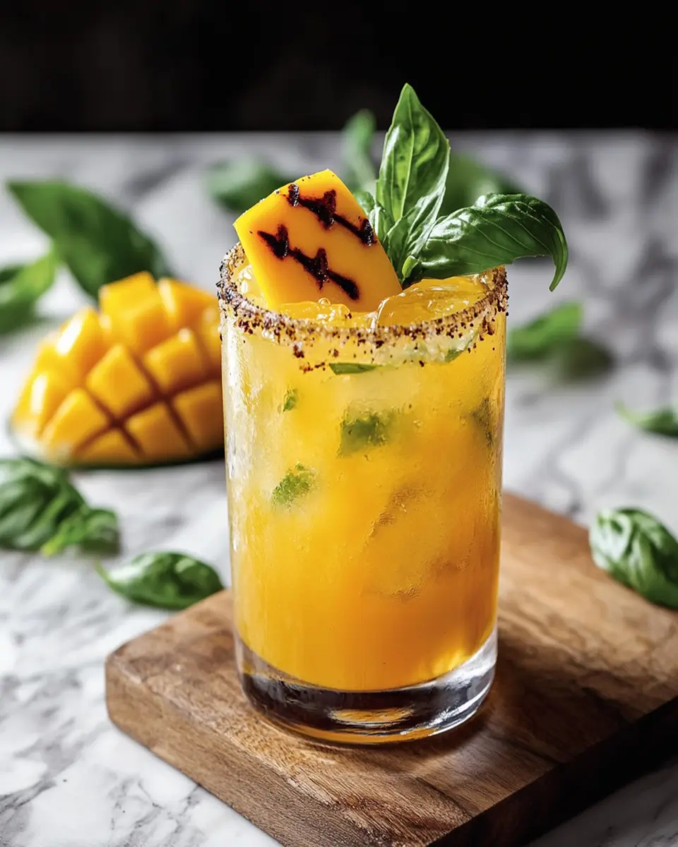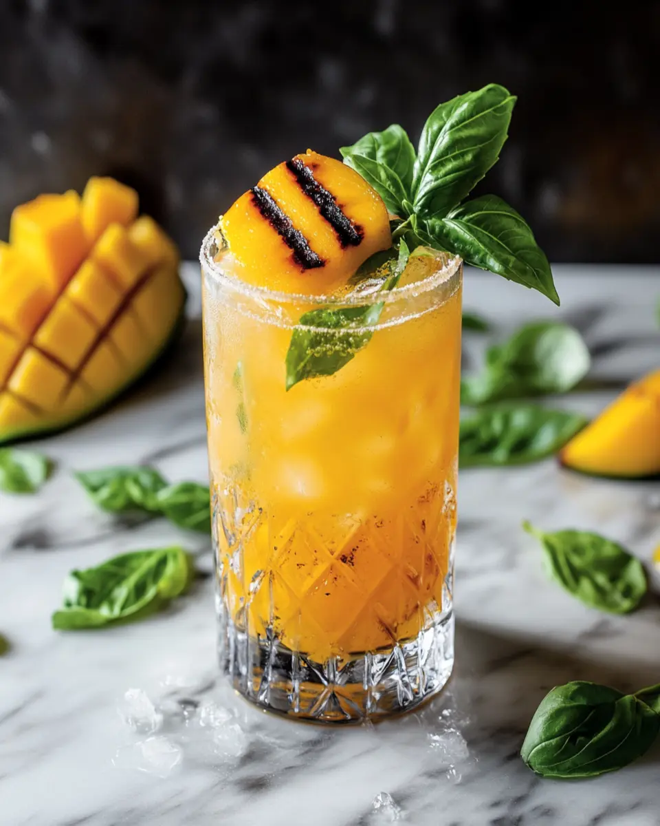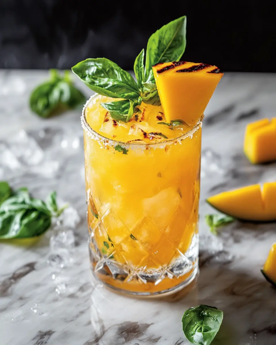 A refreshing twist on a classic margarita, combining the sweetness of grilled mango with the aromatic touch of fresh basil.