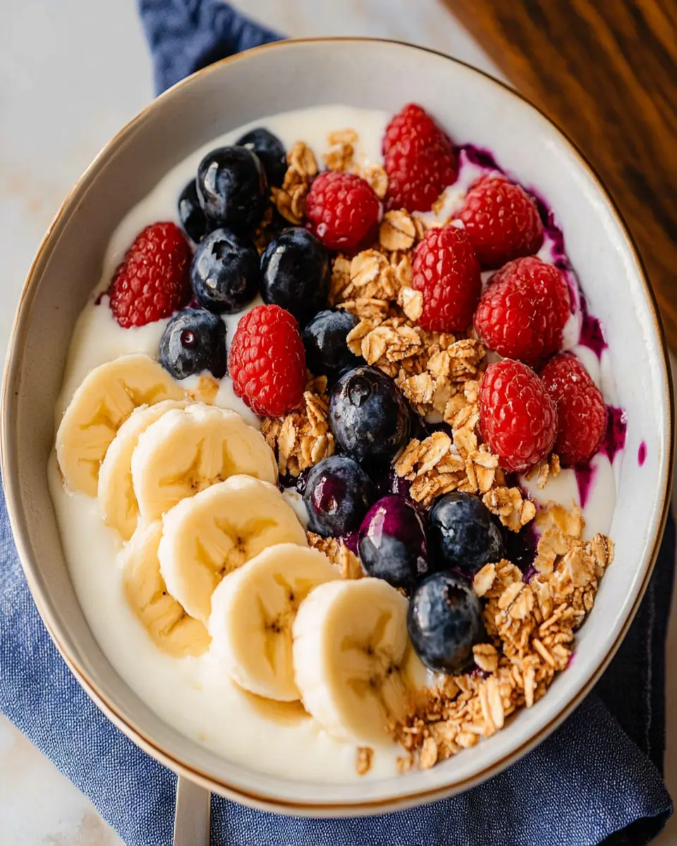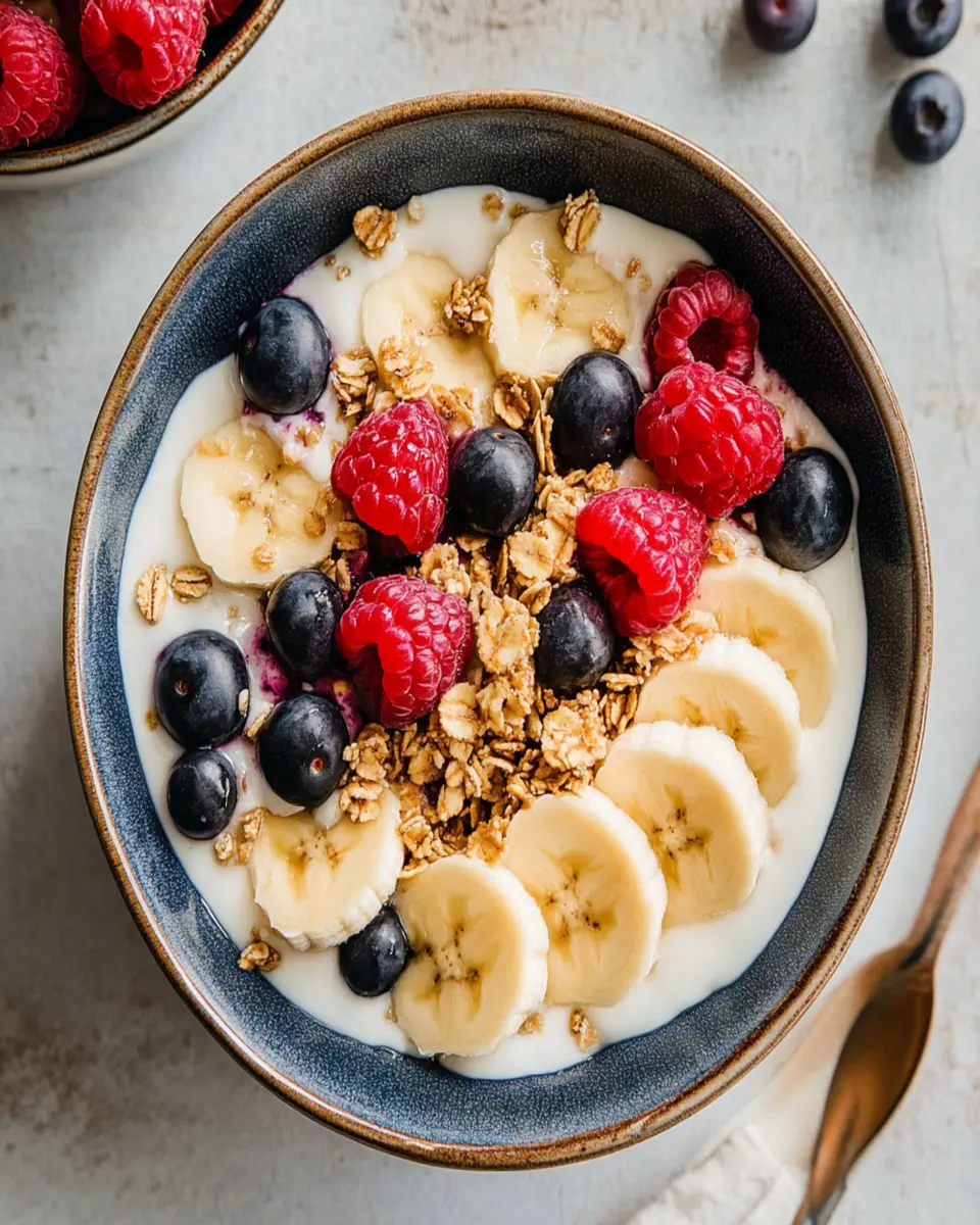 A mix of strawberries, blueberries, and raspberries adds vibrant color and a burst of flavor. Berries are rich in antioxidants and vitamins, making them a perfect complement to the banana and yogurt.