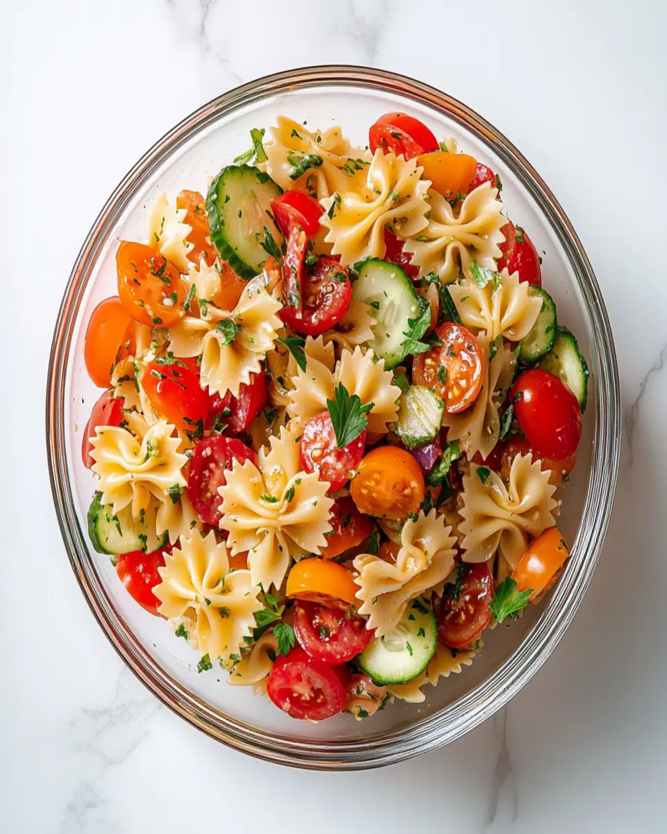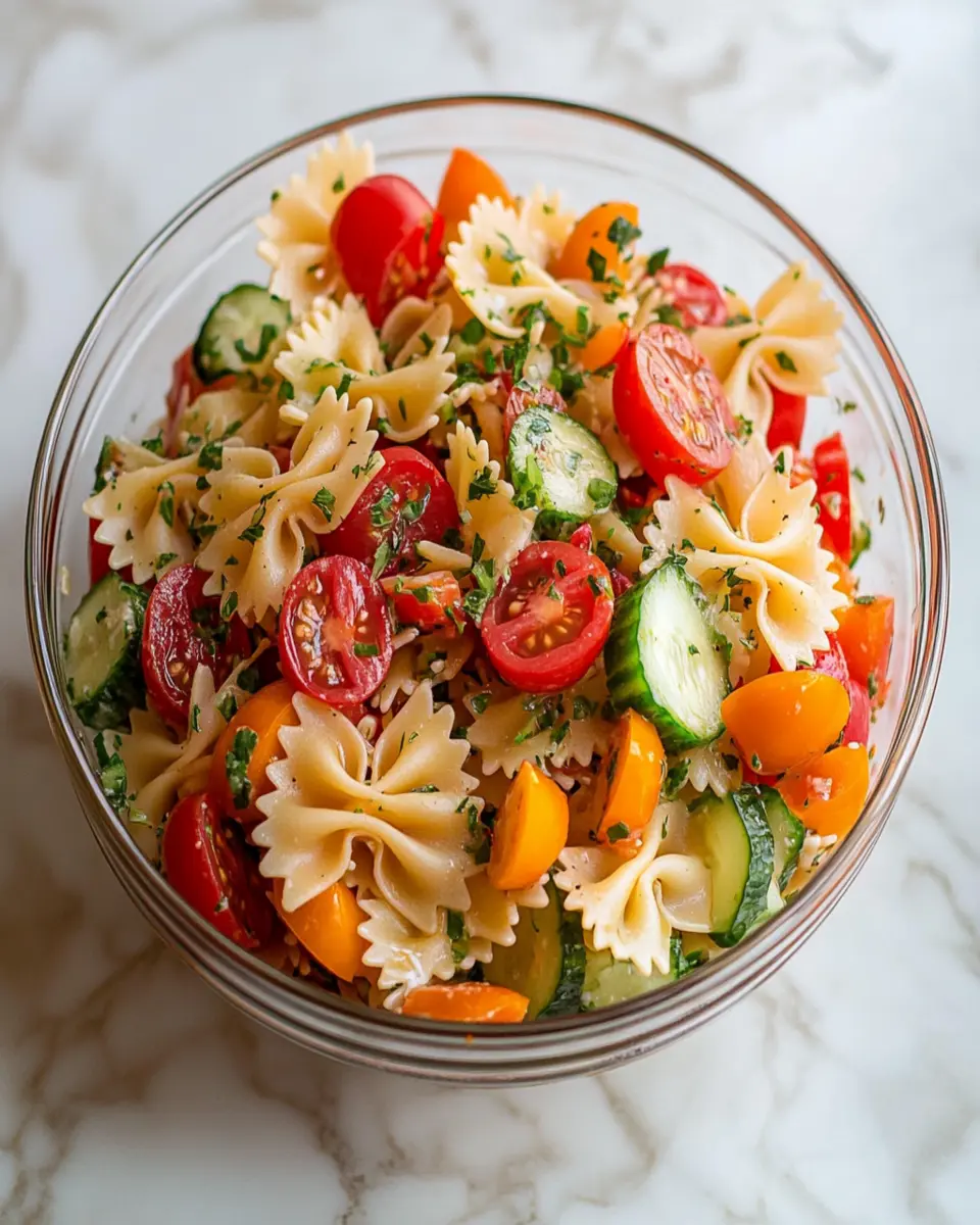 Lastly, this pasta salad is not only visually appealing but also healthy and satisfying. With fresh ingredients and a light dressing, it’s a guilt-free option that doesn’t compromise on flavor. Serve it as a side dish or enjoy it as a light lunch – either way, it’s sure to please. So, get ready to impress your friends and family with this delightful salad!