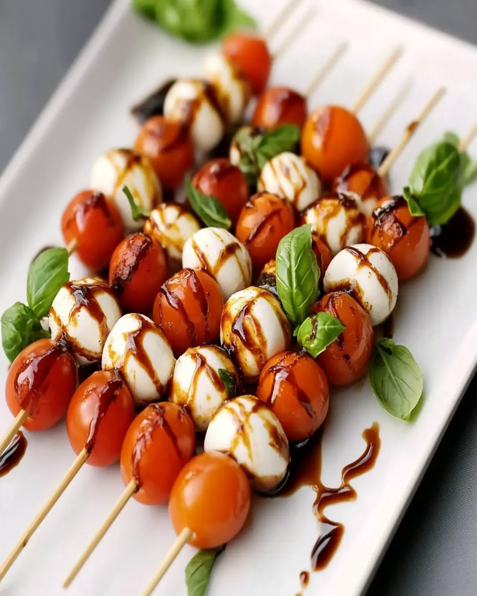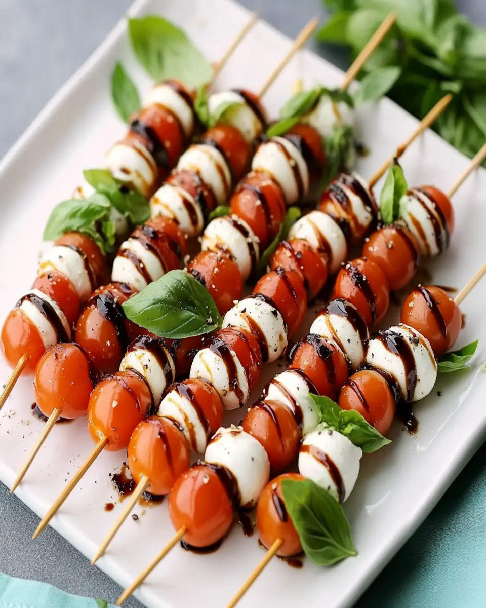Mini Caprese Skewers are a simple yet elegant appetizer made with fresh cherry tomatoes, mozzarella balls, and basil leaves, drizzled with balsamic glaze. They are perfect for gatherings or as a quick snack.