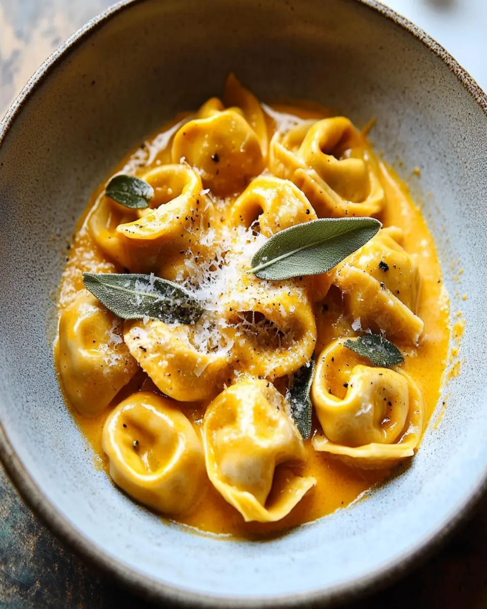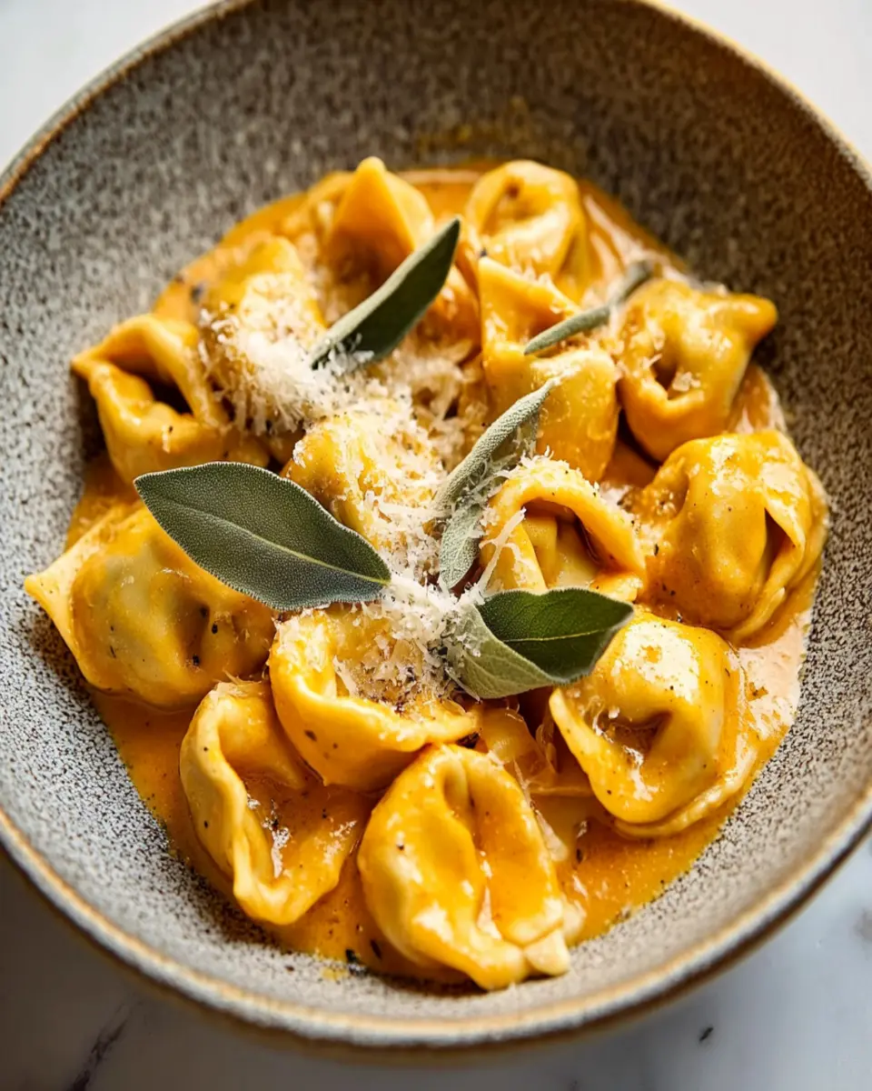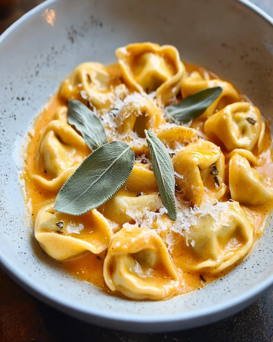 A delicious fall-inspired dish featuring tortellini stuffed with a savory pumpkin filling, served with a rich sauce.
