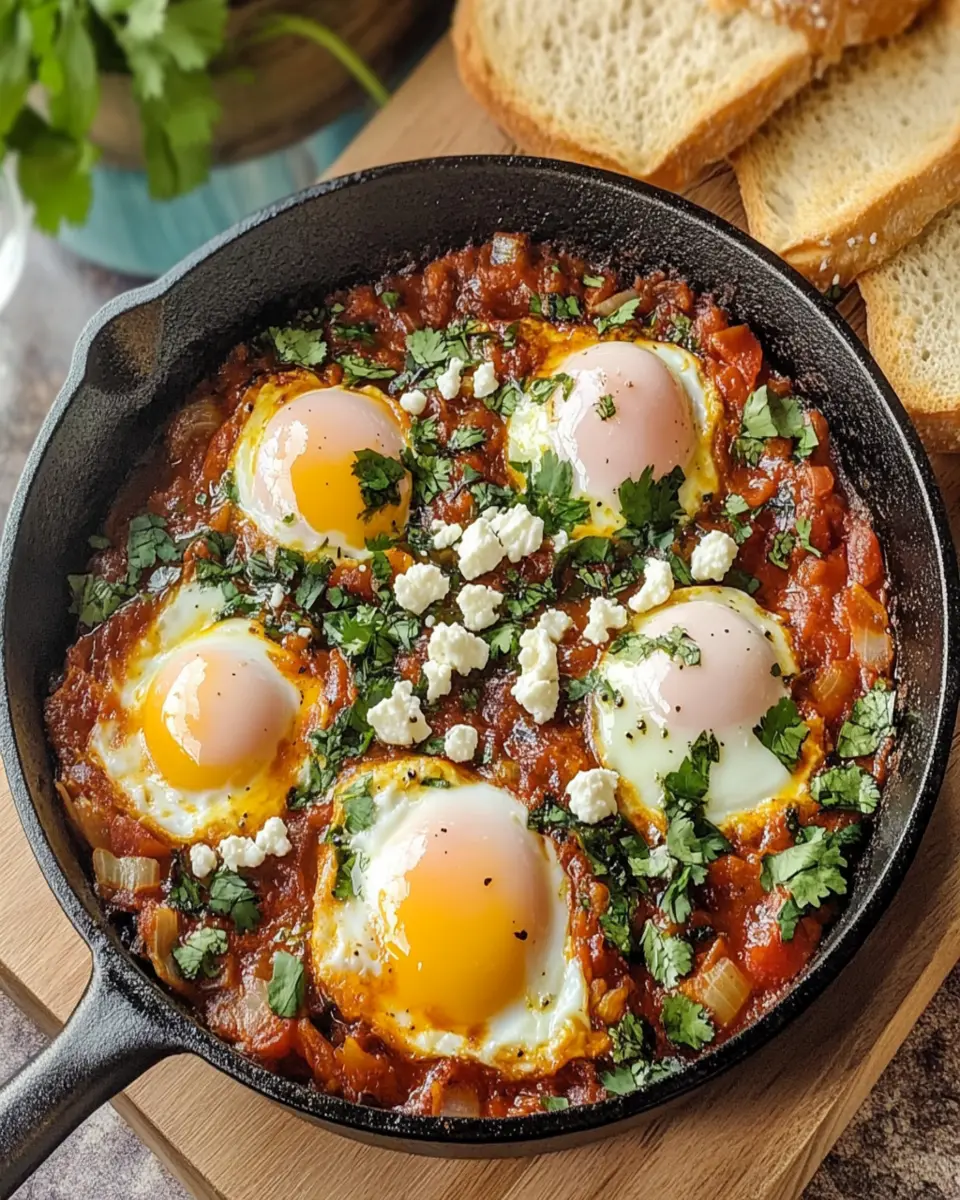 Shakshuka is best served warm, directly from the skillet, and is traditionally enjoyed with crusty bread for dipping. It can also be garnished with fresh herbs like cilantro or parsley and accompanied by feta cheese for added richness.
