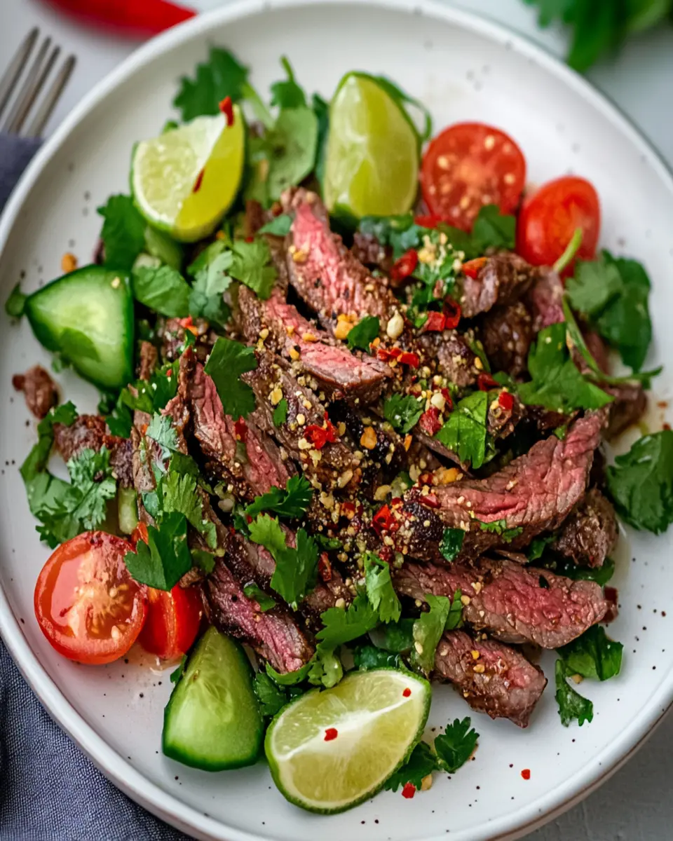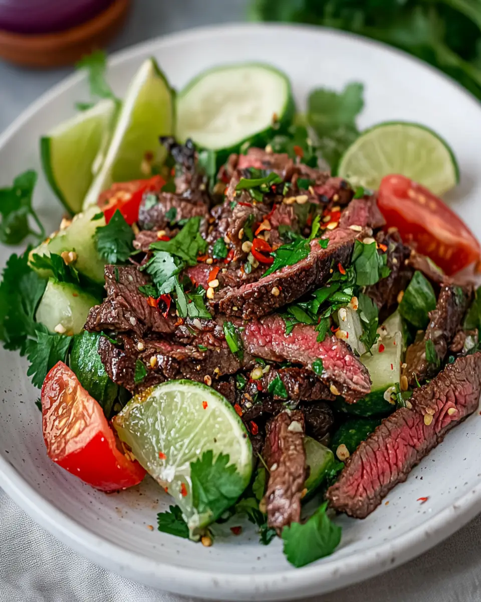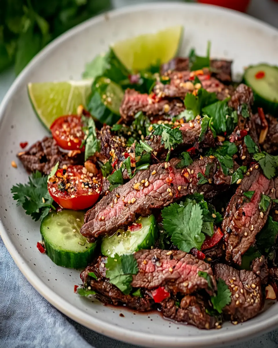 Spicy Grilled Beef Salad, known as Namtok Nuea, is a vibrant Thai dish that features grilled flank steak combined with fresh herbs, vegetables, and a spicy lime dressing. It’s a flavorful, refreshing salad perfect for warm days or as a light meal.