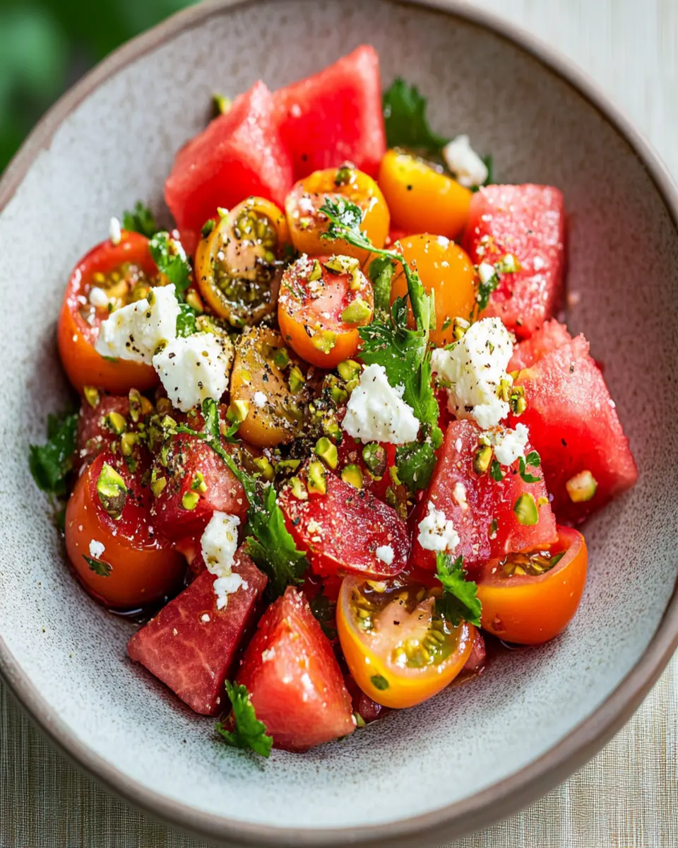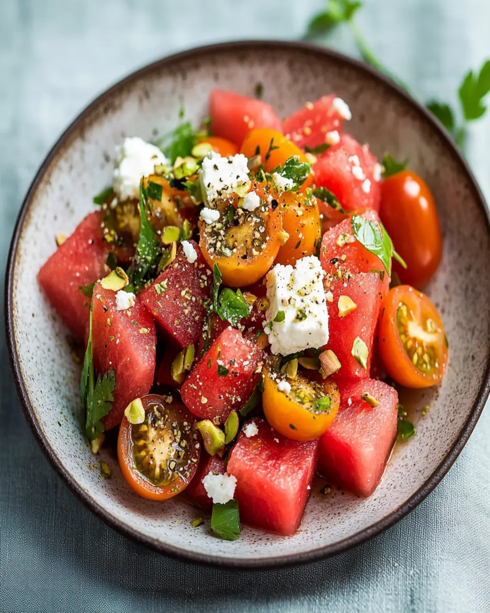 A refreshing summer salad combining juicy watermelon, creamy feta, and ripe tomatoes.
